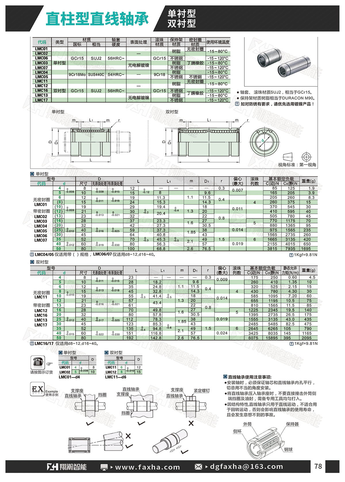 轴套/滚珠材质:SUJ2/SUS440C 密封圈材质:丁腈橡胶 表面处理:未处理/无电解镀镍 产品种类:单衬型/双衬型 使用环境温度:-15~80℃ 产品型号:LMC01-d4~d50 LMC02-d4~d50 LMC03-d4~d50 LMC04-d4~d50