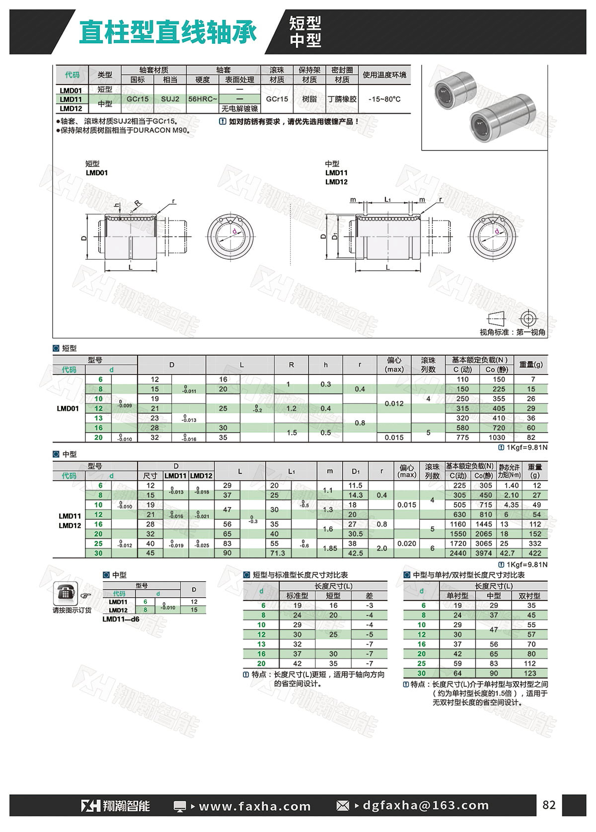 轴套/滚珠材质:SUJ2 密封圈材质:丁腈橡胶 表面处理:未处理/无电解镀镍 产品种类:短型/中型 使用环境温度:-15~80℃ 产品型号:LMD01-d6~d20 LMD11-d6~d30 LMD12-d6~d30